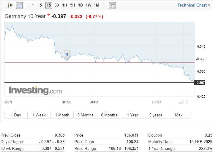 Στη Γερμανία η απόδοση του 10ετούς ομολόγου υποχωρεί στο -0,39% από -0,365%.