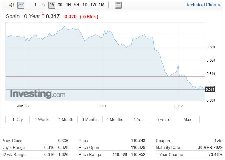 Η απόδοση του 10ετούς ισπανικού ομολόγου διαμορφώνεται στο 0,22% από 0,296%.