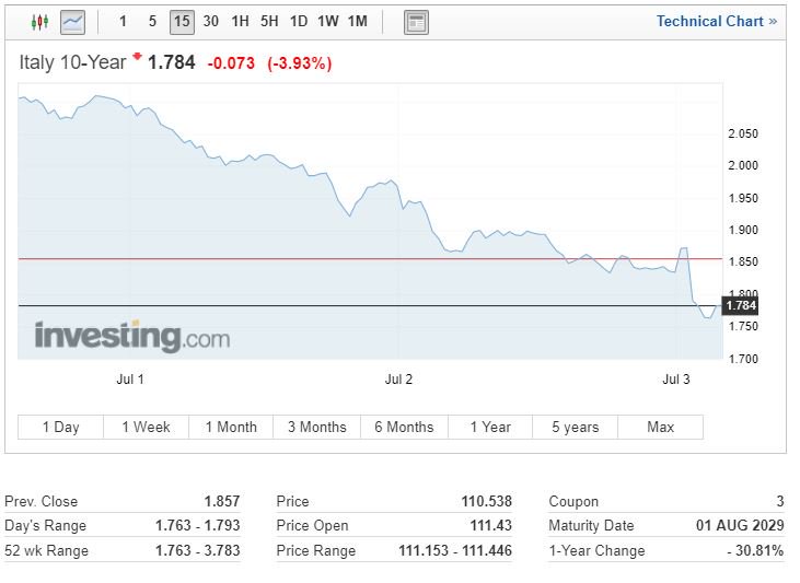 Η απόδοση του 10ετούς στην Ιταλία διαμορφώνεται στο 1,63% από 1,857%.