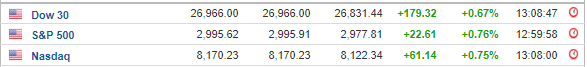 Ο Dow Jones ενισχύθηκε κατά 0,67% κι έκλεισε στις 26.966,00 μονάδες, ο S&P 500 σημείωσε άνοδο 0,77% στις 2.995,82 μονάδες, ενώ ο Nasdaq έκλεισε κατά 0,75% υψηλότερα, στις 8.170,23 μονάδες.