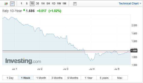 Η απόδοση του ιταλικού 10ετούς ομολόγου έχει μειωθεί περίπου 45 μονάδες βάσης αυτή την εβδομάδα