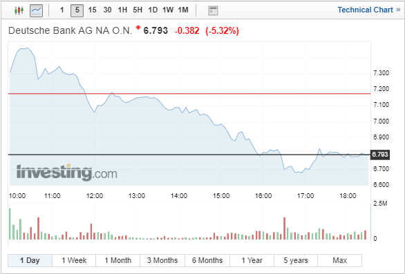 Ισχυρές πιέσεις δέχτηκε η μετοχή της Deutsche Bank, κλείνοντας με απώλειες άνω του 5%, «σβήνοντας» τα κέρδη άνω του 2% που σημείωνε νωρίτερα, καθώς η κορυφαία γερμανική τράπεζα ανακοίνωσε ότι σχεδιάζει την περικοπή 18.000 θέσεων εργασίας, στο πλαίσιο μιας σαρωτικής αναδιάρθρωσης 7,4 δισ. ευρώ, σχεδιασμένη με στόχο την ανάκαμψή της.