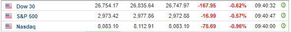 Περί τις 16:30, ο Dow Jones υποχωρεί κατά 0,6% στις 26.770 μονάδες, ο S&P 500 σημειώνει πτώση 0,6% στις 2.974 μονάδες, ενώ ο Nasdaq κινείται κατά 0,9% χαμηλότερα, στις 8.093 μονάδες.