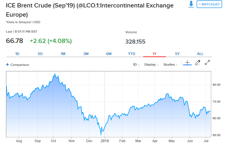 Ειδικότερα, το προθεσμιακό συμβόλαιο Σεπτέμβρίου 2019 για το Brent ενισχύθηκε κατά +4,08% με την τιμή του να διαμορφώνεται στα 66,78 δολ. ανά βαρέλι, την ίδια στιγμή που το προθεσμιακό συμβόλαιο Αυγούστου 2019 για το αμερικανικό αργό είχε κέρδη της τάξης του +4,06% στα 60,18 δολ. ανά βαρέλι.