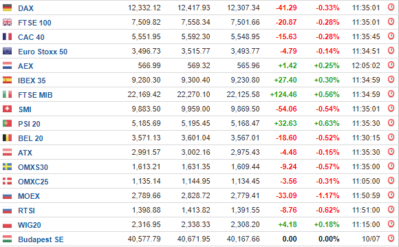 Στη Φρανκφούρτη, ο δείκτης DAX υποχώρησε κατά 0,33% κι έκλεισε στις 12.332,12 μονάδες, ο FTSE 100 στο Λονδίνο σημείωσε πτώση 0,28% στις 7.509,82 μονάδες, ενώ ο CAC 40 στο Παρίσι έκλεισε με απώλειες 0,28% στις 5.551,95 μονάδες.