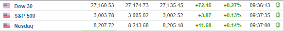 Περί τις 16:30, ο Dow Jones ενισχύεται κατά 0,3% στις 27.162 μονάδες, ο S&P 500 σημειώνει άνοδο 0,1% στις 3.003 μονάδες, ενώ ο Nasdaq κινείται κατά 0,1% υψηλότερα, στις 8.208 μονάδες.