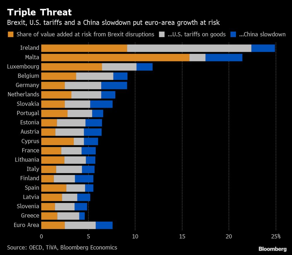 Υπάρχει μεγάλος κίνδυνος τα τρία παραπάνω δεδομένα να χειροτερέψουν, καθώς ένα σκληρό Brexit, ένας εμπορικός πόλεμος μεταξύ ΕΕ και ΗΠΑ και η υποχώρηση της ανάπτυξης της Κίνας, αποτελούν σημαντικά σοκ.