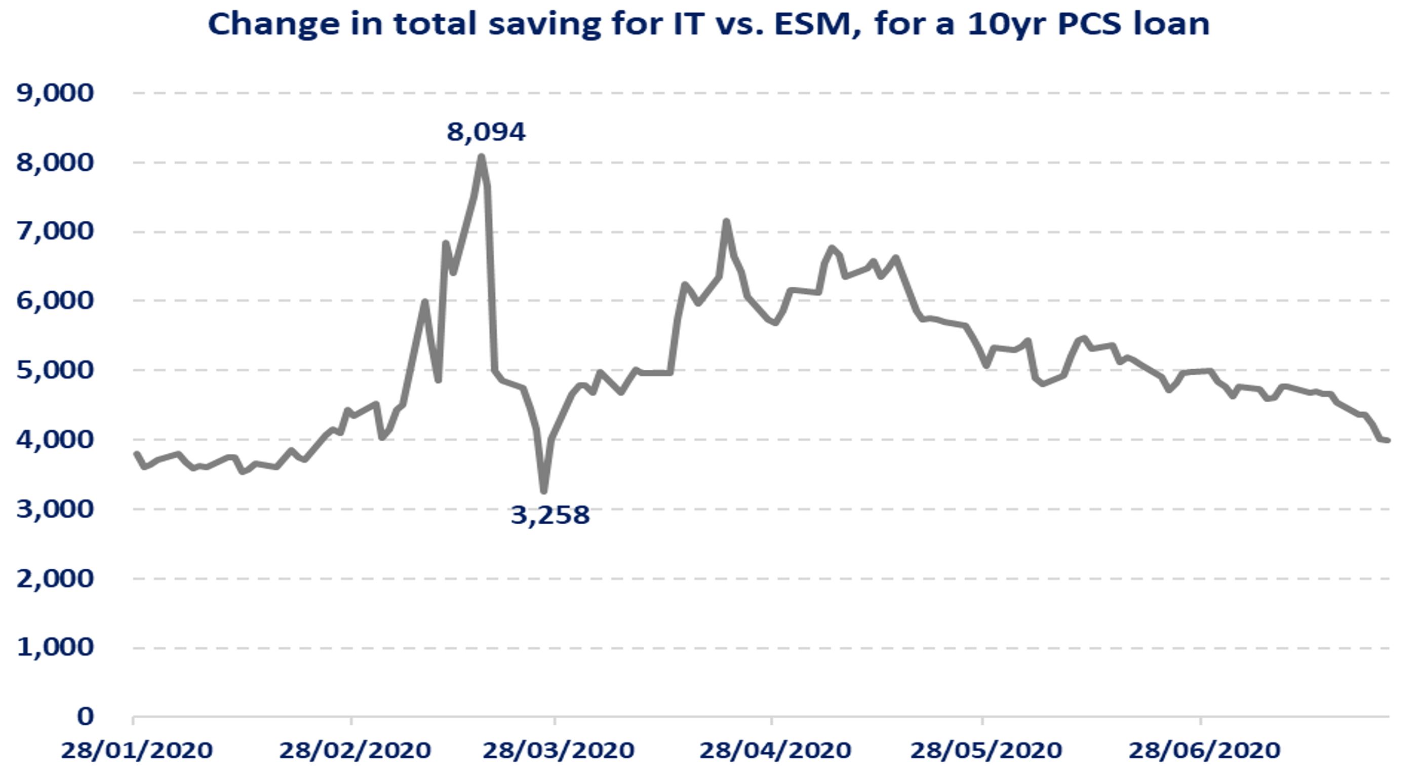 Μετά τη σύσφιξη των τελευταίων δύο εβδομάδων του Μαΐου μετά την ενεργοποίηση της Pandemic Crisis Support, τα spread μεταξύ των ευρωπαϊκών ομολόγων σταθεροποιήθηκαν έως τον Ιούνιο, πριν μειωθούν περαιτέρω από τις αρχές Ιουλίου.