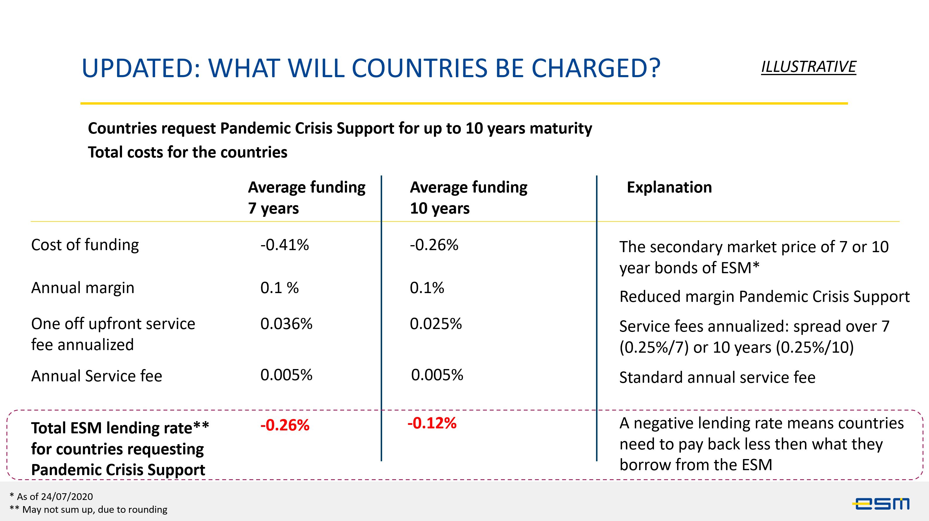 Δείξαμε εκτιμήσεις με βάση τα τρέχοντα επιτόκια της αγοράς για τη διάρκεια 7 και 10 ετών σε σύγκριση με τα ομόλογα που εκδόθηκαν από τους μετόχους του ESM για να δείξουμε τα οφέλη της Pandemic Crisis Support.
