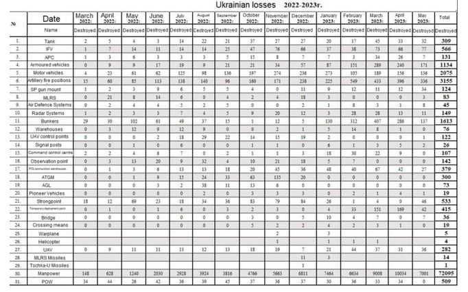 Όπως είπε, από την αρχή της ειδικής στρατιωτικής επιχείρησης έχουν καταστραφεί: 429 αεροσκάφη, 235 ελικόπτερα, 4.371 drones, 424 αντιαεροπορικά πυραυλικά συστήματα, 9.324 άρματα μάχης και άλλα τεθωρακισμένα οχήματα μάχης, 1.100 οχήματα πολλαπλής εκτόξευσης πυραύλων, 4.934 πυροβόλα και όλμους πεδίου, καθώς και 10.527 μονάδες ειδικών στρατιωτικών οχημάτων.