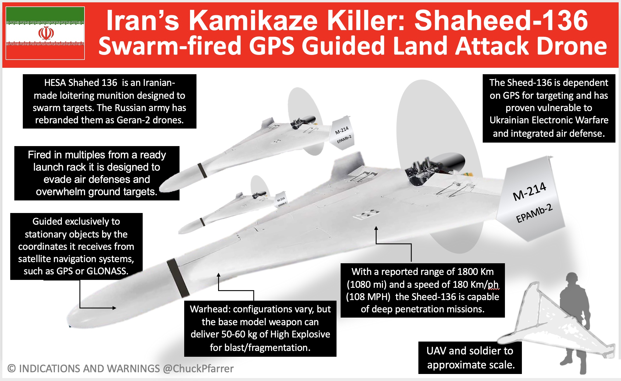 Η στρατιωτική συνεργασία μεταξύ Ρωσίας και Ιράν ξετυλίγεται μέσα από ένα ένα σχέδιο τριών σταδίων από μια κρατική ρωσική εταιρεία για την εγχώρια παραγωγή των ιρανικών drones αυτοκτονίας Shahed 136 - τα οποία η Ρωσία μετονόμασε Geran-2 - με τη βοήθεια του Ιράν.