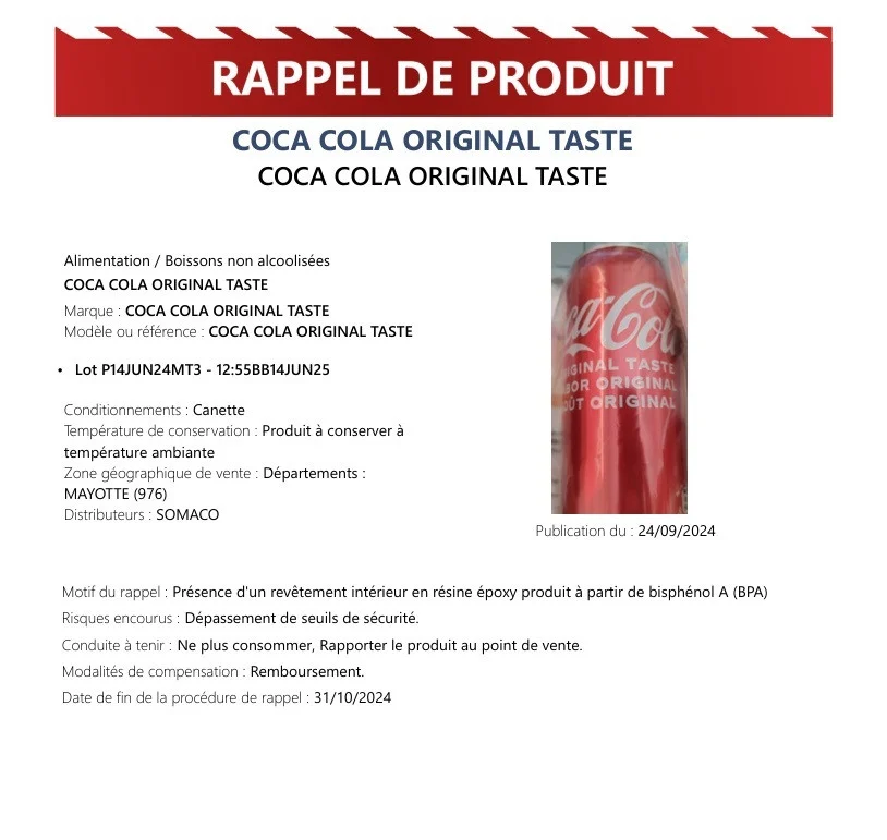 Όπως ανακοινώθηκε από τις αρμόδιες αρχές ανακαλούνται παρτίδες αναψυκτικών Coca Coca (Original Taste) λόγω του εντοπισμού απαγορευμένης χημικής ουσίας στο κουτάκι. Ειδικότερα, αποφασίστηκε άμεση ανάκληση λόγω παρουσίας εσωτερικής επίστρωσης εποξειδικής ρητίνης που παράγεται από δισφαινόλη Α (BPA) που υπερβαίνει τα όρια. Η ανακοίνωση αναφέρει ότι ανακαλείται το σύνολο της παραγωγής αναψυκτικών Coca Cola των παρτίδων P14JUN24MT3 – 12:55BB14JUN25.