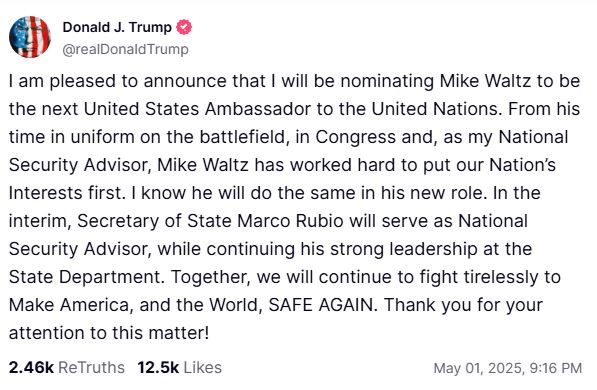 Παράλληλα, ο Αμερικανός πρόεδρος γνωστοποίησε ότι ο νυν ΥΠΕΞ της διοίκησης Trump, Marco Rubio θα πληρώσει προσωρινά τη θέση του Waltz.