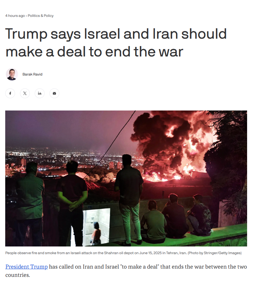«Το Ιράν και το Ισραήλ πρέπει να καταλήξουν σε συμφωνία, και θα καταλήξουν σε συμφωνία», δήλωσε ο Προεδρος των ΗΠΑ Donald Trump σε μία ανάρτηση στην εφαρμογή του Truth Social. «Θα έχουμε ειρήνη, σύντομα, μεταξύ Ισραήλ και Ιράν! Πολλές τηλεφωνικές κλήσεις και συναντήσεις πραγματοποιούνται τώρα», έγραψε, χωρίς να δώσει λεπτομέρειες. Οι επιθέσεις του Ισραήλ στο Ιράν ξεκίνησαν ακόμη και όταν ο πιο πιστός σύμμαχός του, οι ΗΠΑ, επρόκειτο να συμμετάσχει σε έναν νέο γύρο πυρηνικών διαπραγματεύσεων με το Ιράν. Ο πρόεδρος των ΗΠΑ δήλωσε ότι «είναι πιθανό να εμπλακούμε» στη συνεχιζόμενη σύγκρουση μεταξύ Ισραήλ και Ιράν, σε συνέντευξή του στο ABC Ο Trump πρόσθεσε ότι οι ΗΠΑ «δεν εμπλέκονται αυτή τη στιγμή» στη σύγκρουση. Είπε επίσης ότι θα ήταν «ανοιχτός» στο ενδεχόμενο ο Ρώσος πρόεδρος Vladimir Putin να αναλάβει ρόλο μεσολαβητή. «Είναι έτοιμος.