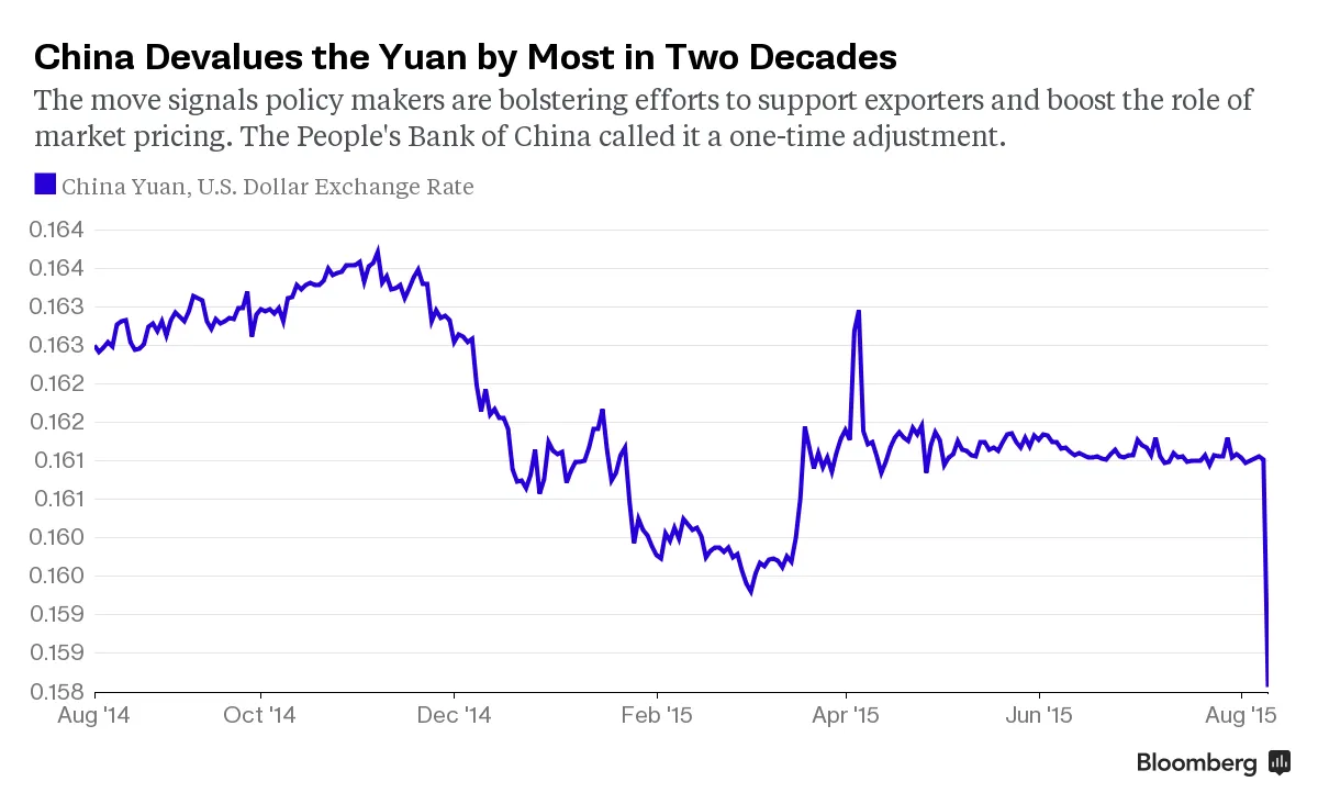 Στις 11 Αυγούστου 2015, η Κίνα σόκαρε τις παγκόσμιες αγορές με τη μεγαλύτερη ημερήσια μείωση του σημείου αναφοράς για το γιουάν, στέλνοντας το νόμισμα να κατρακυλήσει σχεδόν 2% – μια κίνηση που η People’s Bank of China (PBOC) περιέγραψε ως «ενίσχυση του χαρακτήρα του γιουάν ως νομίσματος που στηρίζεται αγορά και ως σημείο αναφοράς έναντι του δολαρίου».