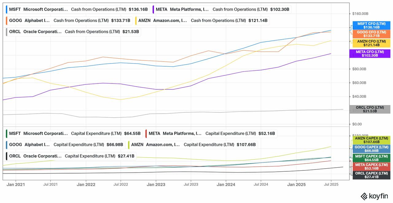 Παρά τις σημαντικές αυξήσεις των κεφαλαιουχικών δαπανών τα τελευταία χρόνια, όλες οι μεγάλες εισηγμένες εταιρείες, εκτός από την Oracle, διαθέτουν μέχρι στιγμής υγιή ελεύθερα ταμειακά διαθέσιμα (FCF).