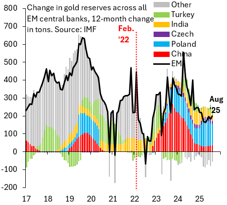 Είναι επίσης πιθανό ότι ο χρυσός θα διατηρήσει τον ρόλο του ως προτεραιότητα στο μεταβαλλόμενο διεθνές χρηματοπιστωτικό σύστημα – ειδικά εάν συνεχιστεί η εμβάθυνση της συνεργασίας στο πλαίσιο των BRICS και άλλων εναλλακτικών διεθνών οργανισμών. Παράλληλα, ο ρυθμός συσσώρευσης θα εξαρτηθεί από την πορεία των τιμών του χρυσού και από τις ανάγκες διαφοροποίησης των αποθεμάτων», κατέληξε ο οικονομολόγος.