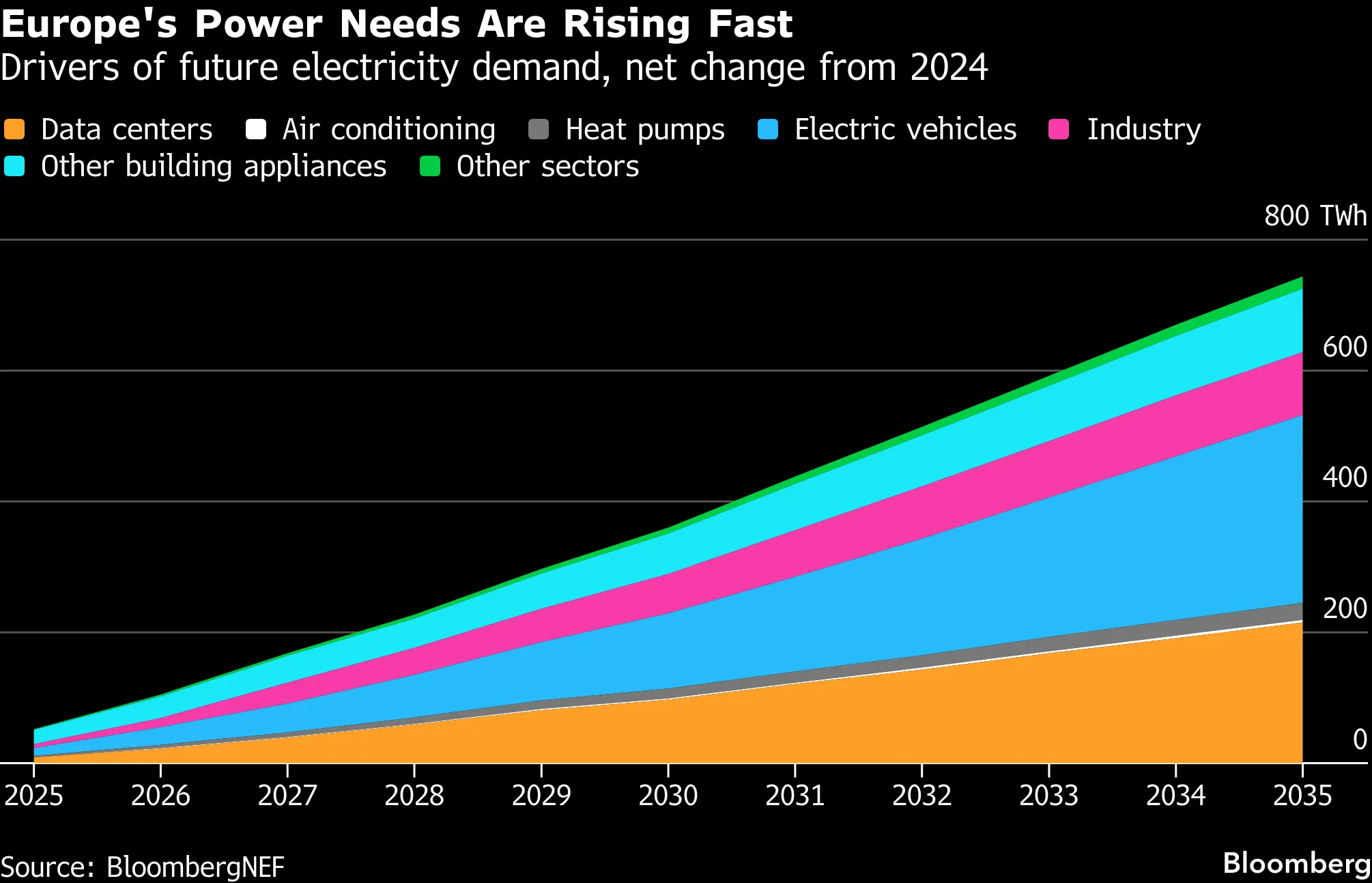 BloombergNEF predicts a 57% increase in final electricity demand by the end of the decade compared with 2024 levels, with the largest share coming from electric vehicles, followed by data centers.