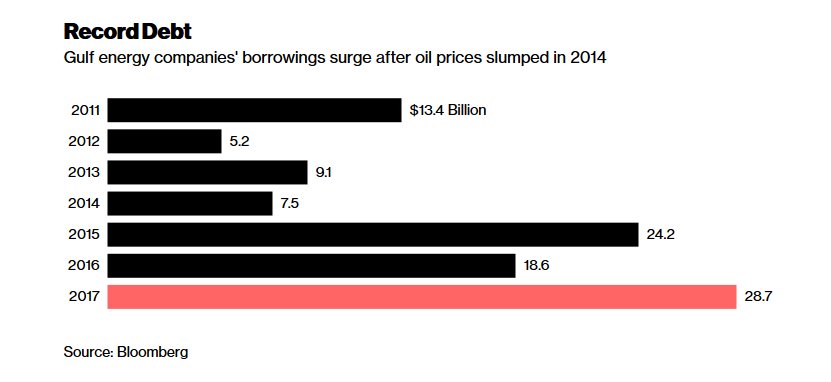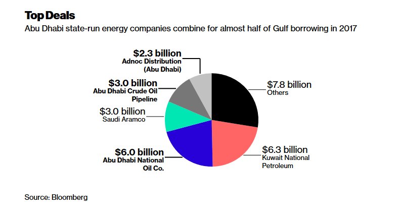 Εταιρείες παραγωγής φυσικού αερίου και πετρελαίου, διαχειριστές αγωγών και διυλιστηρίων σε Κουβέιτ, ΗΑΕ, Σ. Αραβία, Ομάν, Μπαχρέιν και Κατάρ δανείστηκαν το ποσό των 28,7 δισ. δολάρια μέσω ομολόγων και κοινοπρακτικών δανείων του 2017, ξεπερνώντας το προηγούμενο ρεκόρ το οποίο καταγράφηκε το 2015.