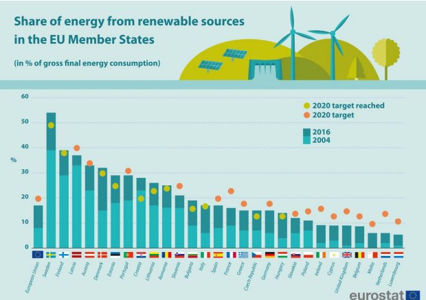 Έντεκα χώρες της ΕΕ έχουν ήδη πιάσει τους στόχους για τις Ανανεώσιμες Πηγές Ενέργειας (ΑΕΠ) μέχρι το 2020, όντας μπροστά από το χρονοδιάγραμμα, ενώ το σύνολο της ΕΕ έχει φτάσει το 17%, του συνολικού στόχου για δύο χρόνια μετά, σύμφωνα με νέα στοιχεία της Eurostat.