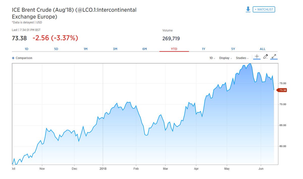 Η βεβαιότητα των επενδυτών ότι ο ΟΠΕΚ θα προχωρήσει σε αύξηση παραγωγής στη συνεδριασή της στις 22 και 23 Ιουνίου του 2018 οδήγησε σε ελεύθερη πτώση την τιμή του μαύρου χρυσού, ο οποίος προσγειώνεται μετά την επίτευξη υψηλών 3,5 ετών τον Μάιο του 2018.