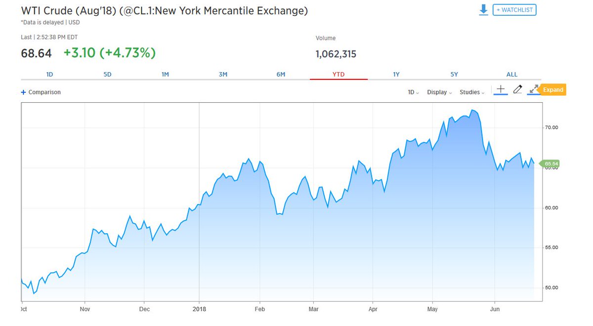 Αποτέλεσμα το προθεσμιακό συμβόλαιο λήξης Ιουλίου 2018 για το αμερικανικό ελαφρύ αργό να ενισχυθεί 4,7% και να διαμορφωθεί στο επίπεδο των 68,71 δολαρίων.