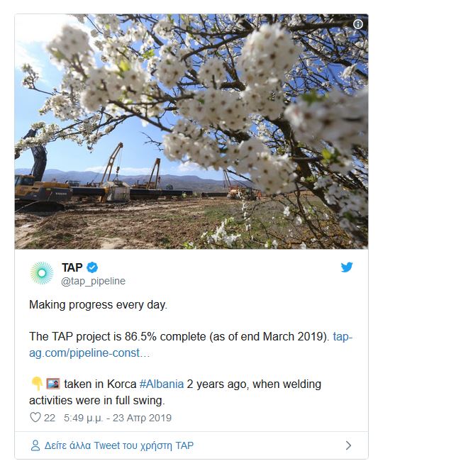 Η κοινοπραξία του TAP ανακοίνωσε ότι στα τέλη Μαρτίου 2019 είχε ολοκληρωθεί η κατασκευή του 86,5% του αγωγού.