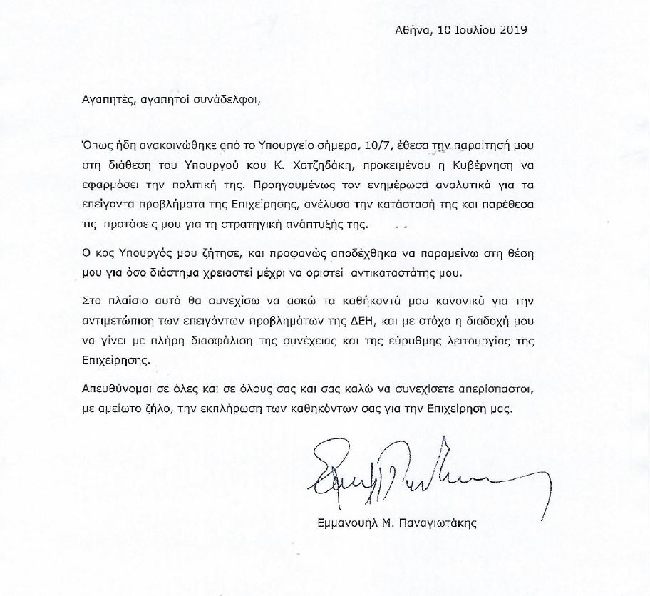 Επιστολή προς τους εργαζομένους της ΔΕΗ έστειλε ο πρόεδρος και διευθύνων σύμβουλος της εισηγμένης , στην οποία τους ενημερώνει ότι υπέβαλλε την παραίτηση του στον υπουργό Κ. Χατζηδάκη, τον οποίο ενημέρωσε αναλυτικά για τη κατάσταση του ομίλου.