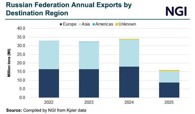 Το 2024, οι ρωσικές εξαγωγές υγροποιημένου φυσικού αερίου στην ΕΕ αυξήθηκαν κατά 18%, με την Ιταλία, την Τσεχική Δημοκρατία και τη Γαλλία μεταξύ των κορυφαίων αγοραστών.