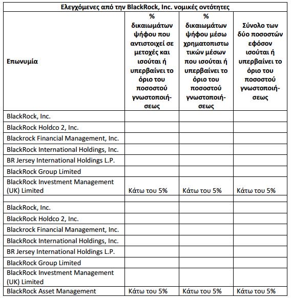 Ειδικότερα, τόσο ο αριθμός δικαιωμάτων ψήφου που εμμέσως κατέχει η BlackRock Inc και ενσωματώνονται σε μετοχές, όσο και ο αριθμός δικαιωμάτων ψήφου που ενσωματώνονται σε χρηματοπιστωτικά μέσα κατήλθαν του ορίου του 5%.