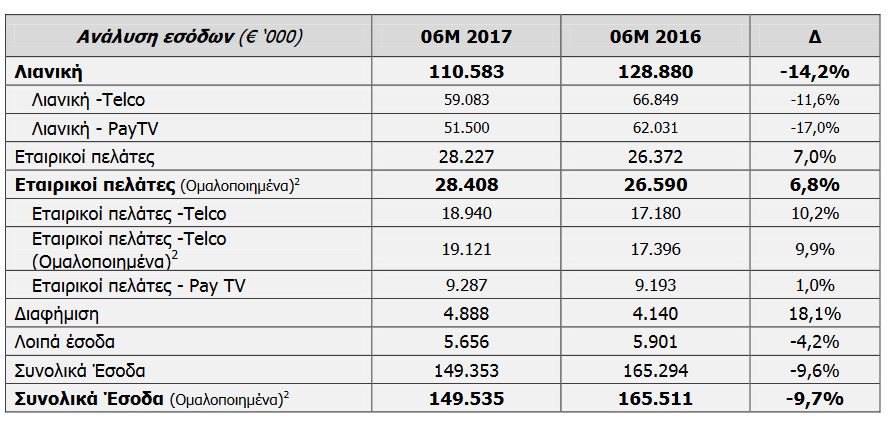 Τα ενοποιημένα ομαλοποιημένα συνολικά έσοδα για το 1ο εξάμηνο του 2017, ανήλθαν στα 149,5 εκατ., παρουσιάζοντας μείωση σε σχέση με το 1ο εξάμηνο του 2016, εξαιτίας της μείωσης της αγοραστικής δύναμης των καταναλωτών και της συντηρητικής προσέγγισης στην εμπορική μας πολιτική.