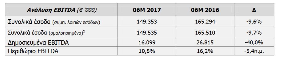Τα EBITDA του 1ου εξαμήνου του 2017 ανήλθαν στα 16,1 εκατ., έναντι 26,8εκατ. του 1ου εξαμήνου του 2016 επηρεαζόμενο