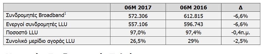 Κατά το 1ο εξάμηνο του 2017 οι ενεργοί συνδρομητές LLU μειώθηκαν στους 557,1 χιλιάδες.