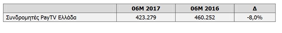 Στο τέλος του 1ου εξαμήνου του 2017, η συνδρομητική βάση PayTV έκλεισε στους 423,3 χιλιάδες συνδρομητές.