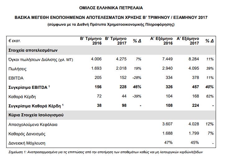 Σε ό,τι αφορά τα Δημοσιευμένα κατά ΔΠΧΠ Αποτελέσματα, επηρεάστηκαν αρνητικά από τη πτώση των τιμών αργού πετρελαίου και προϊόντων, με αποτέλεσμα τα Καθαρά Κέρδη στο Β’ Τρίμηνο να ανέλθουν στα 44 εκατ. ευρώ, έναντι 72 εκατ. ευρώ το β' τρίμηνο 2016, με τα Καθαρά Κέρδη Α’ Εξαμήνου στα 168 εκατ. ευρώ (+62%).