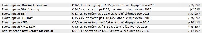 - Αύξηση του όγκου των ενοποιημένων πωλήσεων κατά 10,5% σε σχέση με το αντίστοιχο εξάμηνο του 2016, ως απόρροια των επενδύσεων σε νέες γραμμές παραγωγής κατά τη διετία 2015-2016.