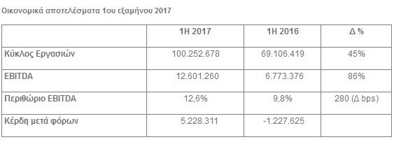 Αποτελέσματα προ τόκων, φόρων, επενδυτικών αποτελεσμάτων και αποσβέσεων (EBITDA): Σε ομιλικό επίπεδο, το EBITDA ανήλθε στα 12,6 εκατ. ευρώ (11,8 εκατ. ευρώ, η Εταιρεία) σημειώνοντας αύξηση 86%, απόρροια τόσο της αύξησης του όγκου πωλήσεων και την βελτίωση της παραγωγικότητας στις δύο παραγωγικές μονάδες του Ομίλου και αφετέρου στην αναλογικά μικρότερη αύξηση των εξόδων διάθεσης αλλά και την διατήρηση των εξόδων διοίκησης στα επίπεδα του 2016. Το EBITDA margin δε, διαμορφώθηκε στο 12,6%, ήτοι 280 bps υψηλότερα έναντι της αντίστοιχης περιόδου πέρυσι.