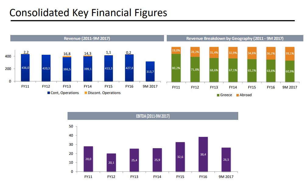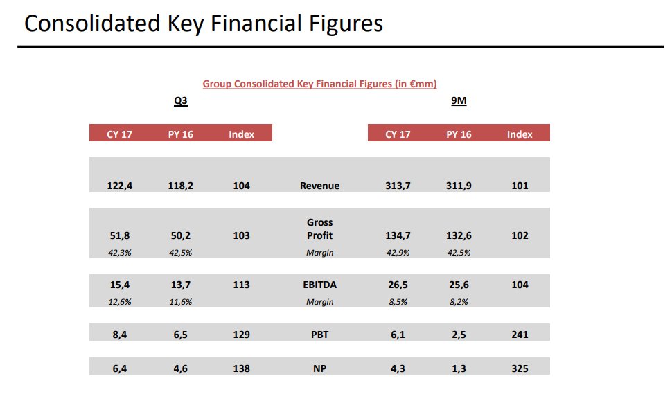 Το EBITDA ανήλθε στα €19,4 εκατ. έναντι € 18,7 εκατ.το εννεάμηνο του 2016, ενώ παρουσίασε κέρδη προ φόρων €6,4 εκατ. έναντι κερδών € 2,5 εκατ. το αντίστοιχο διάστημα του 2016.