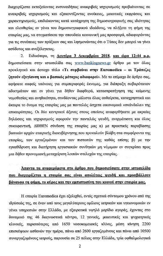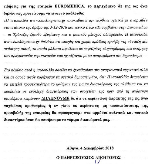Η Euromedica, ζήτησε μέσω εξωδίκου από το bankingnews.gr να αποκατασταθεί η... αλήθεια, επικαλούμενη το δημοσιογραφικό... ιδεώδες (;) και παραθέτοντας επιλεγμένα στοιχεία του ομίλου, όπως τον αριθμό των κλινικών και του ιατρικού και παραϊατρικού προσωπικού.