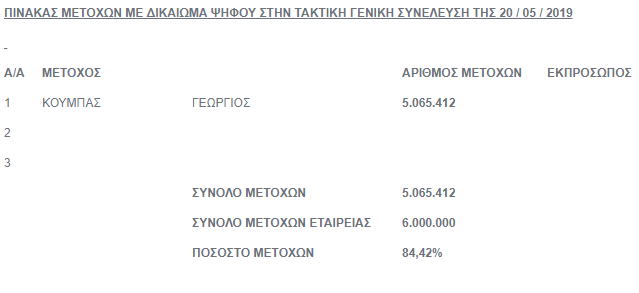 Όπως αναφέρεται σε σημερινή (22/5/2019) ανακοίνωση, στην Γενική Συνέλευση εκ των μετόχων που είχαν δικαίωμα συμμετοχής και ψήφου στη Γενική Συνέλευση παραστάθηκε αυτοπροσώπως στην Γενική Συνέλευση μόνο ένας (1) μέτοχος που εκπροσωπεί 5.065.412 μετοχές, ήτοι ποσοστό 84,42% του καταβεβλημένου μετοχικού κεφαλαίου της Εταιρείας, σύμφωνα με τον παρακάτω πίνακα: