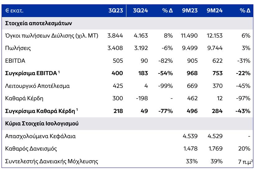 Η παραγωγή προϊόντων από τα διυλιστήρια για το Γ’ Τρίμηνο 2024 αυξήθηκε κατά 6% στους 3,9 εκατ. τόνους, ενώ οι πωλήσεις ανήλθαν σε 4,2 εκατ. τόνους (+8%), στο υψηλότερο επίπεδο από το Γ’ Τρίμηνο 2016, με τις εξαγωγές να αντιστοιχούν στο 46% των συνολικών πωλήσεων.