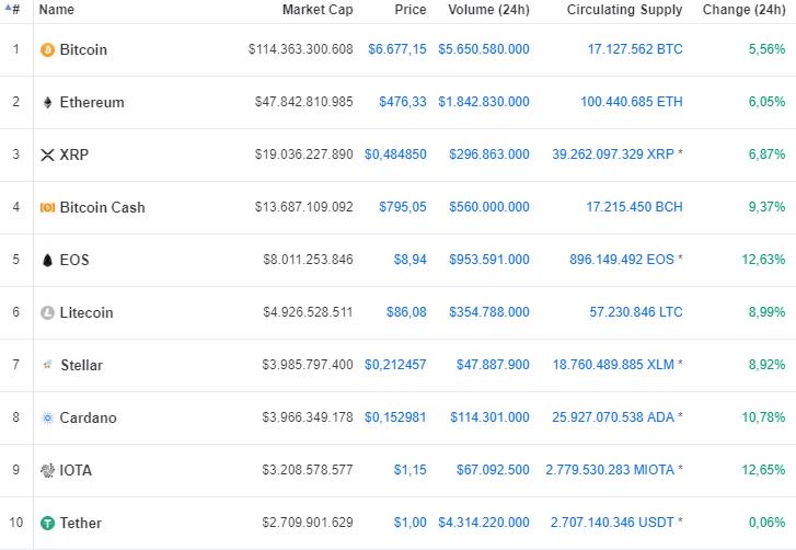 Βέβαια, το Bitcoin δεν έχει καταφέρει ακόμη να ανακτήσει τα 7.000 δολάια ανά μονάδα, διαπραγματευόμενο στα 6.677,2 δολάρια, στην πλατφόρμα «CoinMarketCap».