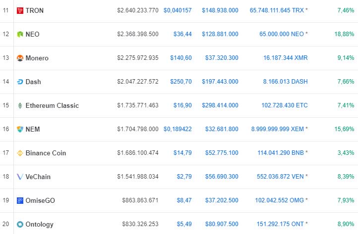 Αναλυτικότερα, τα 20 επικρατέστερα ψηφιακά νομίσματα: