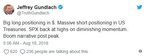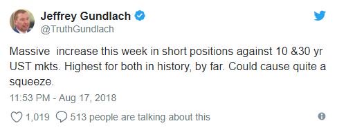 Μέσω Twitter, ο επικεφαλής της DoubleLine Capital υπονόησε τους κερδοσκόπους που «σορτάρουν» τα ομόλογα των ΗΠΑ, «αριθμός-ρεκόρ», ενώ προσέθεσε πως, ταυτόχρονα, παρατηρείται το παράδοξο οι επενδυτές να είναι άκρως αισιόδοξοι για το αμερικανικό δολάριο (θέσεις long).