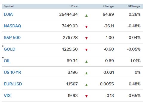 Ο Dow Jones ενισχύθηκε κατά 0,26% στις 25.444,34 μονάδες, ο S&P 500 σημείωσε πτώση 0,04% στις 2.767,78 μονάδες, ενώ ο Nasdaq κινείται κατά 0,48% χαμηλότερα, στις 7.449,03 μονάδες.