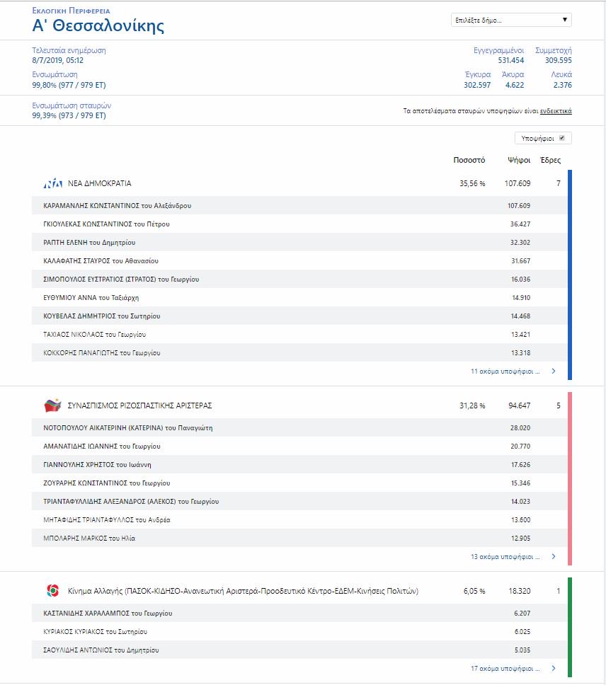 Η Νέα Δημοκρατία επικράτησε στην Α' Θεσσαλονίκης με τον πρώην πρόεδρο του κόμματος και πρώην πρωθυπουργό Κωνσταντίνο Καραμανλή να κατακτά την πρώτη θέση με περισσότερες από 107.000 ψήφους.