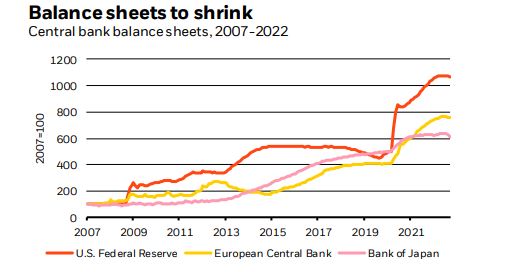 Επιπλέον, η συρρίκνωση των ισολογισμών των κεντρικών τραπεζών ασκεί πίεση στις μακροπρόθεσμες λήξεις των κρατικών ομολόγων, αυξάνοντας τον κίνδυνο να προκληθεί χάος στην αγορά.
