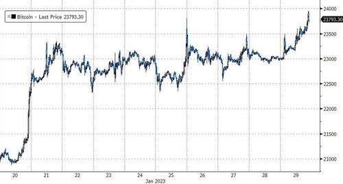 Εντυπωσιακή άνοδο 55% από τα χαμηλά του Νοεμβρίου 2022 παρουσιάζει το Bitcoin το οποίο την Κυριακή (29/1/2023) διαπραγματευόταν σχεδόν στα 24.000 δολάρια... ...το υψηλότερο από τα μέσα Αυγούστου, ξεπερνώντας την κατάρρευση του ανταλλακτηρίου FTX.