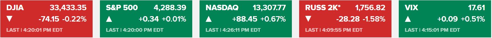Ειδικότερα, ο δείκτης Dow Jones υποχώρησε -0,22% στις 33.433 μον., ο δείκτης S&P 500 σημείωσε οριακές μεταβολές στις 4.288 μον. και ο δείκτης Nasdaq κατέγραψε άνοδο +0,67% στις 13.307 μον.