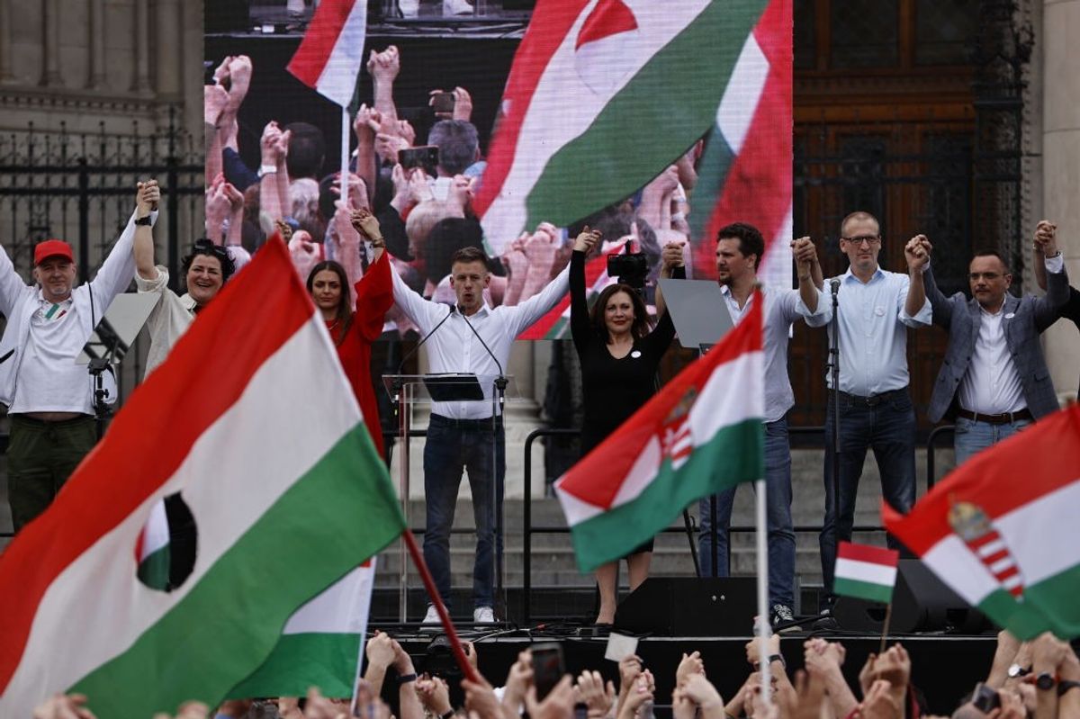 Ο Peter Magyar, που αποκαλείται από το αμερικανικό κρατικό μέσο ενημέρωσης Radio Free Europe/Radio Liberty «ανερχόμενος αμφισβητίας» του Ούγγρου πρωθυπουργού, ηγήθηκε της συγκέντρωσης.